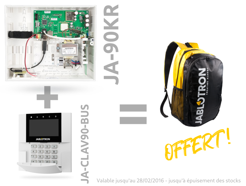 Profitez de notre opération commerciale sur la Jablotron 90 avec un pack clavier + centrale à prix canon, et pour tout kit commandé avant le 28/02 (inclus), recevez un sac à dos Jablotron parfait pour le retour des beaux jours.